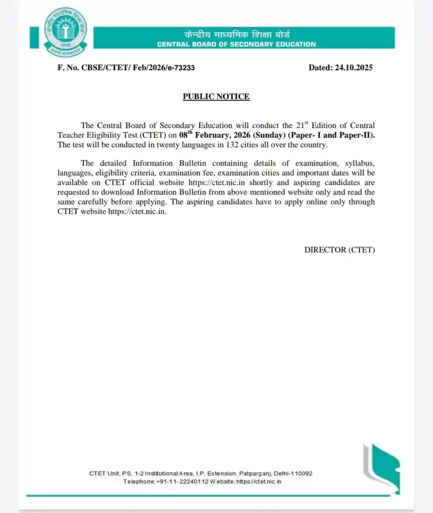 सीटेट 2026 का आधिकारिक नोटिफिकेशन 24 अक्टूबर 2025 को जारी किया गया।